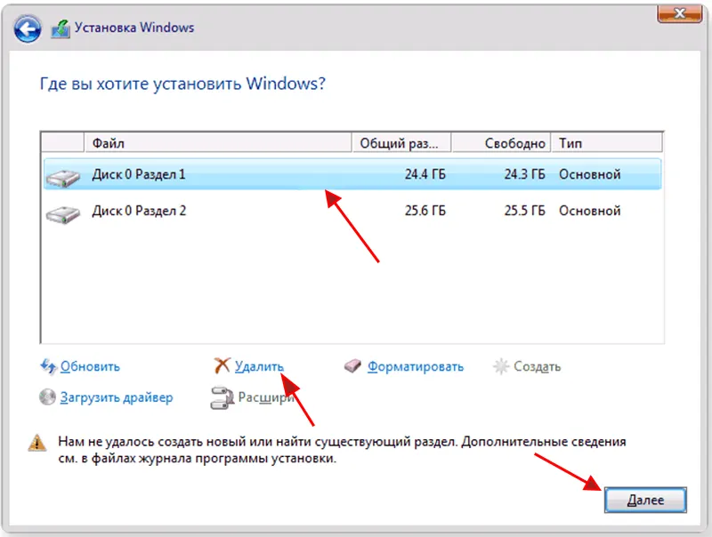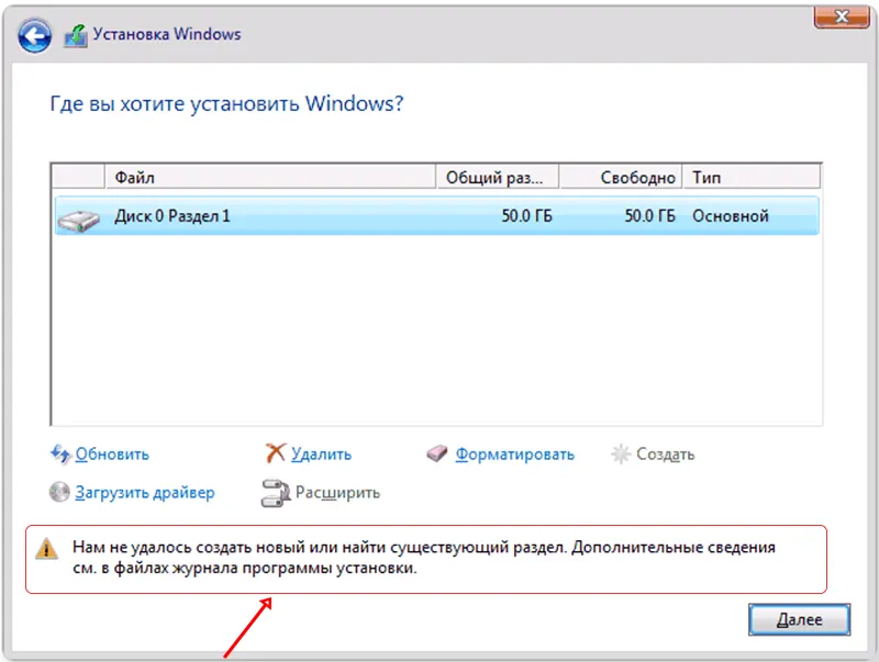 «Нам не удалось создать новый или найти существующий раздел. Дополнительные сведения см. в файлах журнала программы установки.»