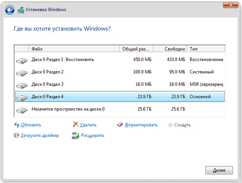 - Закройте консоль и нажмите «Обновить» в окне выбора разделов. Выберите раздел для установки (не «Незанятое пространство») и жмите «Далее» — установщик сам задействует освобождённые 700 МБ под системные области.
