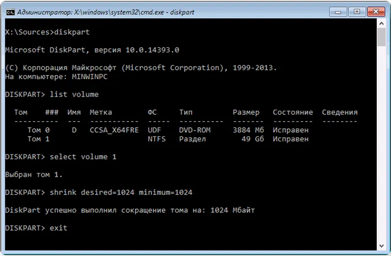 Вариант 2.1 — сжатие тома через diskpart (прямо из установщика)
