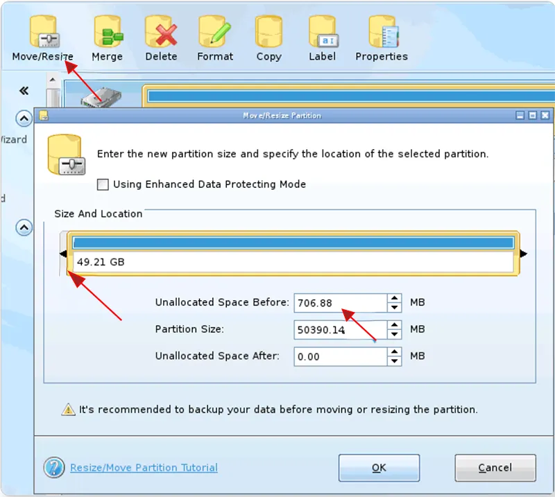 - В программе выберите первый раздел диска → Move/Resize → освободите ~700 МБ слева (в начале диска).