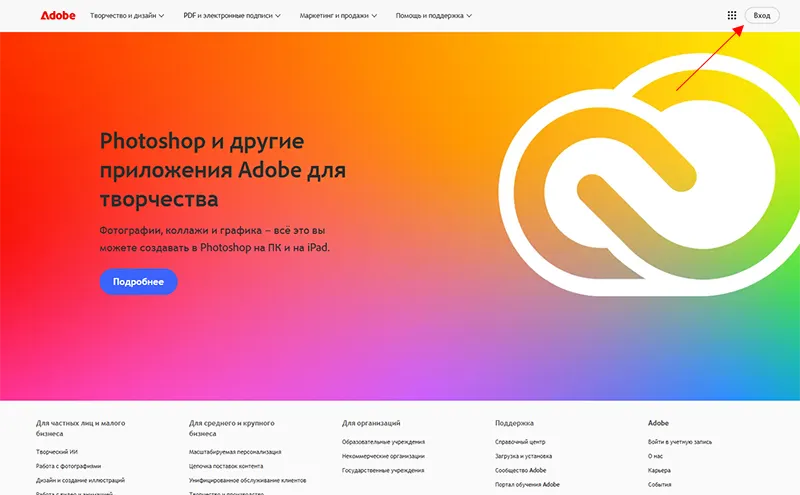 Перейдите на официальный сайт Adobe. В верхнем правом углу страницы нажмите кнопку «Sign in» (Войти).